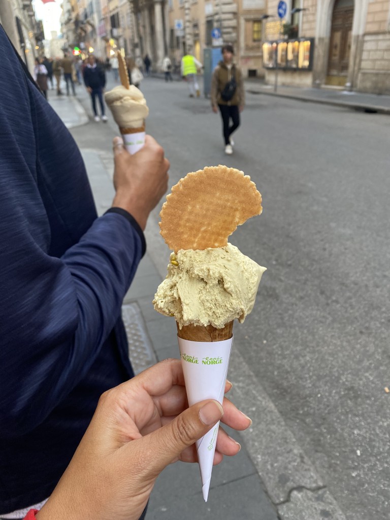 Then we see the street and people are walking all over it and you can also drive your car on the pebble streets in Rome which is so amazing! The streets are filled with every name brand designer you can think of. Intertwined with numerous churches, countless restaurants, places to stay and gelato shops. Of course we check out the gelato shop and the churches. I believe the gelato shop is called Coni Norge Di Carlo Galli & C. Snc. I think there may be a church on every corner in Rome and I think we may have went in about twenty of them!